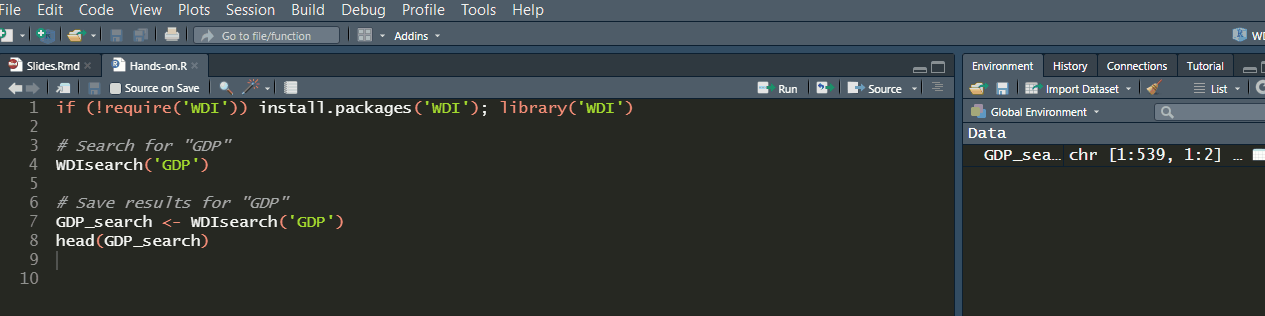 count: false class: inverse, center, title-slide, middle <style> .title-slide .remark-slide-number { display: none; } </style> # Collect and use open access World Bank data to know your country ### [`Bruno Thiago Tomio`](https://bttomio.github.io) <a href="https://github.com/bttomio" class="github-corner" aria-label="View source on Github"><svg width="80" height="80" viewBox="0 0 250 250" style="fill:#fff; color:#151513; position: absolute; top: 0; border: 0; right: 0;" aria-hidden="true"><path d="M0,0 L115,115 L130,115 L142,142 L250,250 L250,0 Z"></path><path d="M128.3,109.0 C113.8,99.7 119.0,89.6 119.0,89.6 C122.0,82.7 120.5,78.6 120.5,78.6 C119.2,72.0 123.4,76.3 123.4,76.3 C127.3,80.9 125.5,87.3 125.5,87.3 C122.9,97.6 130.6,101.9 134.4,103.2" fill="currentColor" style="transform-origin: 130px 106px;" class="octo-arm"></path><path d="M115.0,115.0 C114.9,115.1 118.7,116.5 119.8,115.4 L133.7,101.6 C136.9,99.2 139.9,98.4 142.2,98.6 C133.8,88.0 127.5,74.4 143.8,58.0 C148.5,53.4 154.0,51.2 159.7,51.0 C160.3,49.4 163.2,43.6 171.4,40.1 C171.4,40.1 176.1,42.5 178.8,56.2 C183.1,58.6 187.2,61.8 190.9,65.4 C194.5,69.0 197.7,73.2 200.1,77.6 C213.8,80.2 216.3,84.9 216.3,84.9 C212.7,93.1 206.9,96.0 205.4,96.6 C205.1,102.4 203.0,107.8 198.3,112.5 C181.9,128.9 168.3,122.5 157.7,114.1 C157.9,116.9 156.7,120.9 152.7,124.9 L141.0,136.5 C139.8,137.7 141.6,141.9 141.8,141.8 Z" fill="currentColor" class="octo-body"></path></svg></a><style>.github-corner:hover .octo-arm{animation:octocat-wave 560ms ease-in-out}@keyframes octocat-wave{0%,100%{transform:rotate(0)}20%,60%{transform:rotate(-25deg)}40%,80%{transform:rotate(10deg)}}@media (max-width:500px){.github-corner:hover .octo-arm{animation:none}.github-corner .octo-arm{animation:octocat-wave 560ms ease-in-out}}</style> <a href="https://github.com/bttomio/WDI---2021-Talk"><img style="position: absolute; top: 0; left: 0; border: 0;" src="https://s3.amazonaws.com/github/ribbons/forkme_left_white_ffffff.png" alt="Fork me on GitHub"></a> --- count: false class: inverse, center, middle # General view --- # World Bank data in <svg viewBox="0 0 581 512" style="height:1em;position:relative;display:inline-block;top:.1em;" xmlns="http://www.w3.org/2000/svg"> <path d="M581 226.6C581 119.1 450.9 32 290.5 32S0 119.1 0 226.6C0 322.4 103.3 402 239.4 418.1V480h99.1v-61.5c24.3-2.7 47.6-7.4 69.4-13.9L448 480h112l-67.4-113.7c54.5-35.4 88.4-84.9 88.4-139.7zm-466.8 14.5c0-73.5 98.9-133 220.8-133s211.9 40.7 211.9 133c0 50.1-26.5 85-70.3 106.4-2.4-1.6-4.7-2.9-6.4-3.7-10.2-5.2-27.8-10.5-27.8-10.5s86.6-6.4 86.6-92.7-90.6-87.9-90.6-87.9h-199V361c-74.1-21.5-125.2-67.1-125.2-119.9zm225.1 38.3v-55.6c57.8 0 87.8-6.8 87.8 27.3 0 36.5-38.2 28.3-87.8 28.3zm-.9 72.5H365c10.8 0 18.9 11.7 24 19.2-16.1 1.9-33 2.8-50.6 2.9v-22.1z"></path></svg> The `WDI` package allows us to search and download data from the World Bank (several datasets, with thousands of variables) -- **Advantages** - Reproducible research -- - Annual, quarterly, and monthly data in long format -- - Collect, plot, analyse, and estimate econometric models in the same free software -- **Important links** - Package website, developed by [Vincent Arel-Bundock](vincent.arel-bundock@umontreal.ca) </br> [https://vincentarelbundock.github.io/WDI/index.html](https://vincentarelbundock.github.io/WDI/index.html) -- - DataBank, to check variables details </br> [https://databank.worldbank.org/](https://databank.worldbank.org/) -- - `wbstats` (alternative package) </br> [http://nset-ornl.github.io/wbstats/index.html](http://nset-ornl.github.io/wbstats/index.html) --- count: false class: inverse, center, middle # Hands-on Based on the package website </br> https://vincentarelbundock.github.io/WDI/index.html --- **Installation** ```r install.packages('WDI') ``` -- **Searching for data** You need to use **keywords** to search for data with the command `WDIsearch` ```r # Search for 'GDP' WDIsearch('GDP') ``` -- You can create an object in the global environment to easily navigate all the variables with the keyword ```r # Save results for 'GDP' GDP_search <- WDIsearch('GDP') ```  --- **Collect data** *GDP per capita for France (FR) and Brazil (BR)* ```r # indicator = NY.GDP.PCAP.KD / name = GDP per capita (constant 2010 US$) indicator <- c("GDP per capita" = 'NY.GDP.PCAP.KD') dat1 <- WDI(indicator, country=c('FR', 'BR'), end = 2019) head(dat1) ``` ``` ## iso2c country GDP per capita year ## 1 BR Brazil 11121.74 2019 ## 2 BR Brazil 11079.71 2018 ## 3 BR Brazil 11021.72 2017 ## 4 BR Brazil 10965.97 2016 ## 5 BR Brazil 11431.15 2015 ## 6 BR Brazil 11951.21 2014 ``` *GDP per capita (US$ and local currency unity) for France (FR) and Brazil (BR)* ```r # indicators = NY.GDP.PCAP.KD and NY.GDP.PCAP.KN / names = GDP per capita (constant 2010 US$) # and GDP per capita (constant LCU) indicators <- c("GDP per capita (US$)" = 'NY.GDP.PCAP.KD', "GDP per capita (LCU)" = "NY.GDP.PCAP.KN") dat2 <- WDI(indicators, country=c('FR', 'BR'), end = 2019) head(dat2) ``` ``` ## iso2c country year GDP per capita (US$) GDP per capita (LCU) ## 1 BR Brazil 1960 3417.352 6011.806 ## 2 BR Brazil 1961 3660.391 6439.361 ## 3 BR Brazil 1962 3740.433 6580.170 ## 4 BR Brazil 1963 3664.978 6447.429 ## 5 BR Brazil 1964 3685.493 6483.519 ## 6 BR Brazil 1965 3692.846 6496.454 ``` --- **Plot data (1/2)** ```r library(ggplot2) # GDP per capita for France and Brazil ggplot(dat1, aes(year, `GDP per capita`, color=country)) + geom_line() + xlab('Year') + ylab('GDP per capita') ``` <img src="Slides_files/figure-html/unnamed-chunk-6-1.png" style="display: block; margin: auto;" /> --- **Plot data (2/2)** ```r # GDP per capita (US$ and local currency unity) for France and Brazil *library(ggthemes) ggplot(dat2, aes(year, color=country)) + * geom_line(aes(year, `GDP per capita (US$)`)) + * geom_line(aes(year, `GDP per capita (LCU)`), linetype = "dashed") + xlab('Year') + ylab('GDP per capita') + * labs(caption = "GDP per capita (US$), solid; GDP per capita (LCU), dashed") + * theme_economist() + *